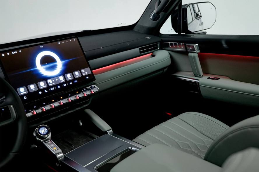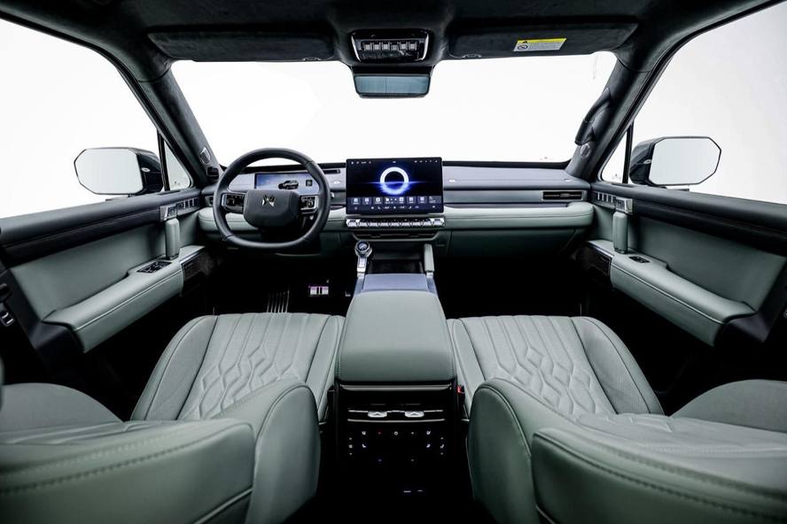 猛士M817座舱横平竖直、中轴对称,搭配金属质感材质,塑造硬朗机甲风格;内饰91.2%软包包覆,包覆面积达32㎡,人体与座椅接触面大面积选用Nappa真皮,皮质细腻,顶棚及后备厢采用高档绒质面料,硬派越野也可触手皆豪华。