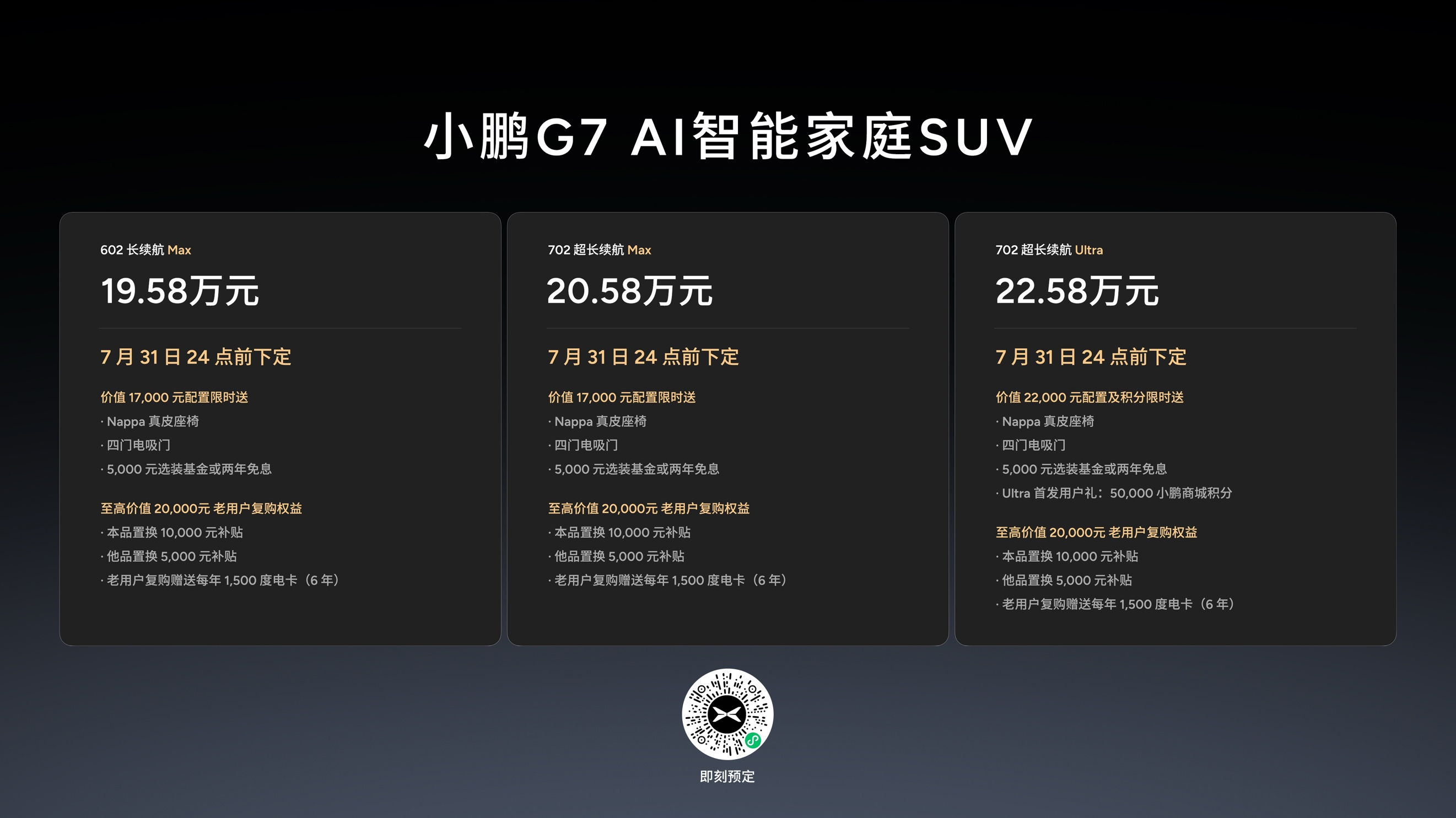 (2025年7月3日,北京),小鹏汽车正式发布全新AI智能家庭SUV——小鹏G7。新车共推出602长续航Max、702超长续航Max、702超长续航Ultra三个版本,官方指导售价分别为19.58万元、20.58万元和22.58万元,上市即刻可以交付。小鹏G7带来了无忧礼、交付礼、置换礼、复购礼等多重上市权益,在7月31日24点前下订,可获得价值8000元Nappa真皮座椅、价值4000元前/后排静音电吸门、一年智能辅助驾驶安心服务、5000元选装基金或两年免息金融方案,下订Ultra版还可额外获得50000小鹏商城积分。此外,老用户复购还有至高20000元超值权益。