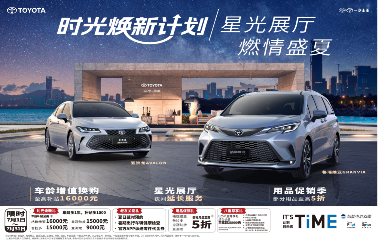 营销层面,一汽丰田上半年推出了 “时光焕新计划”,该计划指立足用户购车和用车全周期,推出车龄增加一年补贴增加 1000 元的“车龄增值补贴”机制,彻底为用户消除时间担忧与里程焦虑。7月1日—7月31日,一汽丰田真诚加码:车龄增值换购至高补贴 16000 元;星光展厅延长夜间服务,帮助用户避开酷暑轻松看车;格瑞维亚、普拉多、皇冠陆放、亚洲龙部分用品至高 5 折;购买 bZ5 可享价值 10000 元的金融自由舱、0 首付 3 年 0 息、置换补贴 10000 元、免费充电桩及安装服务等八重尊享礼,综合价值至高超 38000 元;更有丰厚老友关爱礼,让用户的盛夏驾享之旅更省心。