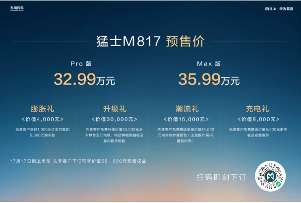 智野无界,城野随心。7月17日,“风华正猛——猛士M817技术发布暨新车预售”在武汉举行。东风猛士科技与华为联合发布了专为猛士M817量身打造的“豪华智能越野技术解决方案”,“全栈华为、全域通达、全维安全”三大硬核技术集群,尽展“铁血猛士”与“满血华为”的顶流实力,让猛士M817成为“智能越野第一车”,成为“越野车中最智能、智能车中最越野”的豪华智能越野SUV。活动上,猛士M817同步开启预售,新车提供两个版本,其中猛士M817 Pro版预售价32.99万元,猛士M817 Max版预售价35.99万元,即日起下订可享价值58,000元限时预售权益。