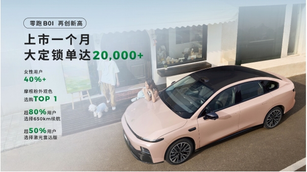零跑B01的市场表现同样亮眼。这款定位“年轻人高品质智能轿车”的车型,上市一个月大定锁单超20000台,且10000台交付达成仅用时37天。其中女性用户占比超40%,有超过80%的用户选择650km长续航版本,激光雷达版本选购超50%。此外,摩根粉外观色成为用户选购TOP1,9月还将继续供用户免费选配。