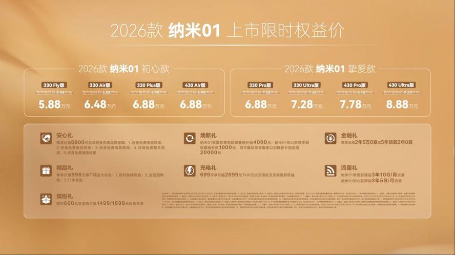 当价值远高于价格,是给予用户最大的诚意,也是纳米01面向市场最大的底气。新车特别推出「初心款」与「挚爱款」双版本共计8款车型,限时焕新指导价5.88-8.88万元,并且为用户准备了安心礼、金融礼、精品礼、缤纷礼等七重大礼。