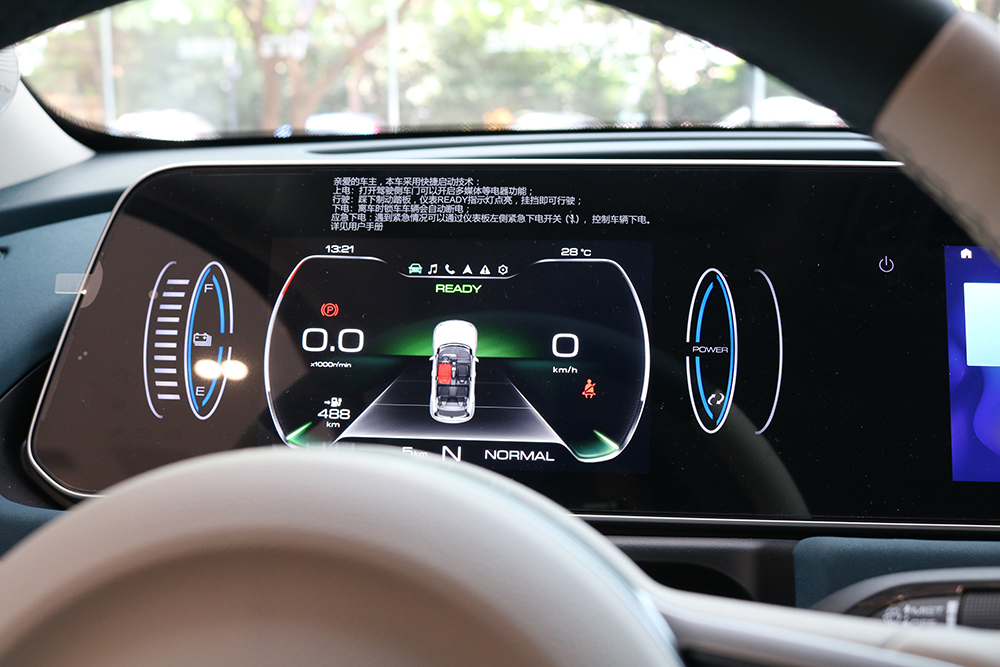 欧拉好猫莫兰迪版的中控大屏和液晶仪表是贯穿式设计, 7英寸的全液晶仪表盘的显示效果非常细腻,且在功能性上也比较全面,可显示续航、车辆电压、功率导航、智能辅助驾驶等信息均可在仪表中获取。